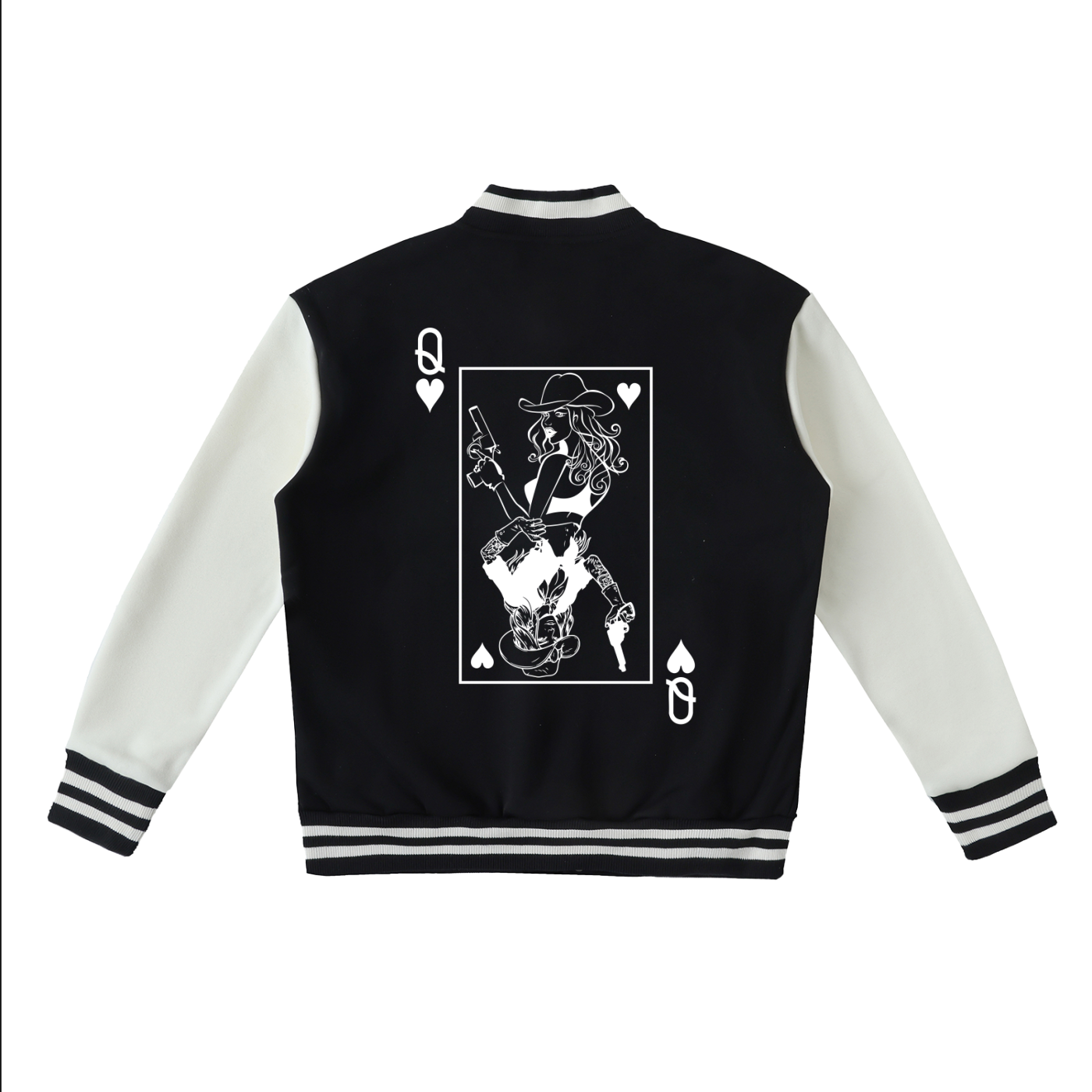 Die PIA BOLTE® „Rebel Queen Jacket“ ist ein kraftvolles Fashion-Statement für alle, die Streetstyle und Luxus vereinen wollen. Das ikonische Rückendesign mit der Queen-of-Spades-Karte im Western-Cowgirl-Look macht diese Collegejacke zum absoluten Hingucker. Schwarze Front, weiße Ärmel und sportliche Kontraststreifen an Kragen und Bündchen unterstreichen den authentischen Varsity-Vibe.