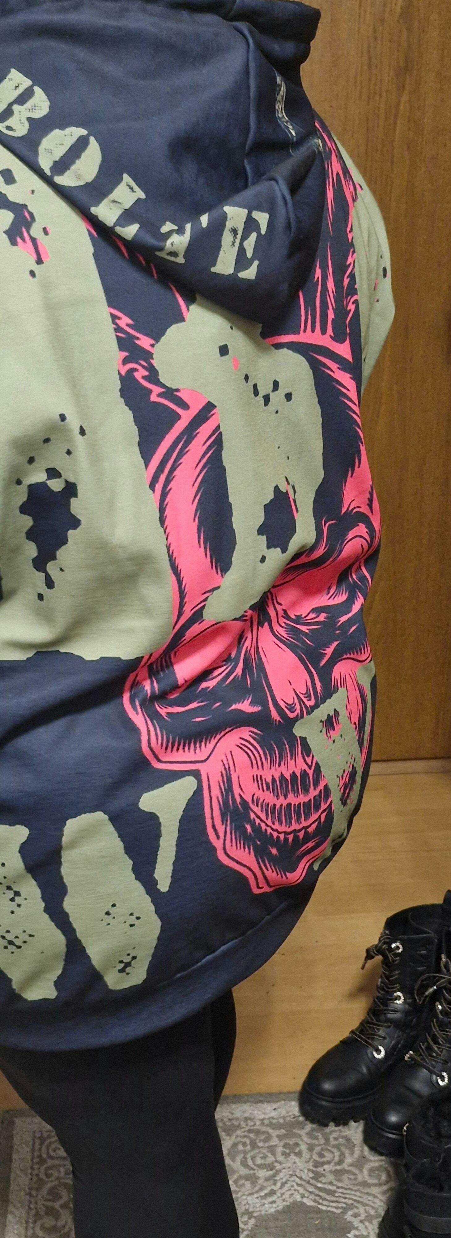 Der dominante Totenkopf mit pinken Akzenten, kombiniert mit olivfarbenen Grafiken, militärisch inspirierten Patches und goldenen Details, steht für Freiheit, Stärke und Selbstbewusstsein.