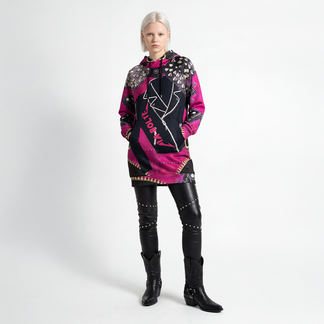 Dieser markante Long Hoodie kombiniert kraftvolle Prints, ikonische PB-Symbole und den unverwechselbaren Street-Glam-Look, für den PIA BOLTE® steht. Das Design vereint urbane Ausdruckskraft mit edlem High-Fashion-Flair und setzt bewusst ein starkes visuelles Statement.