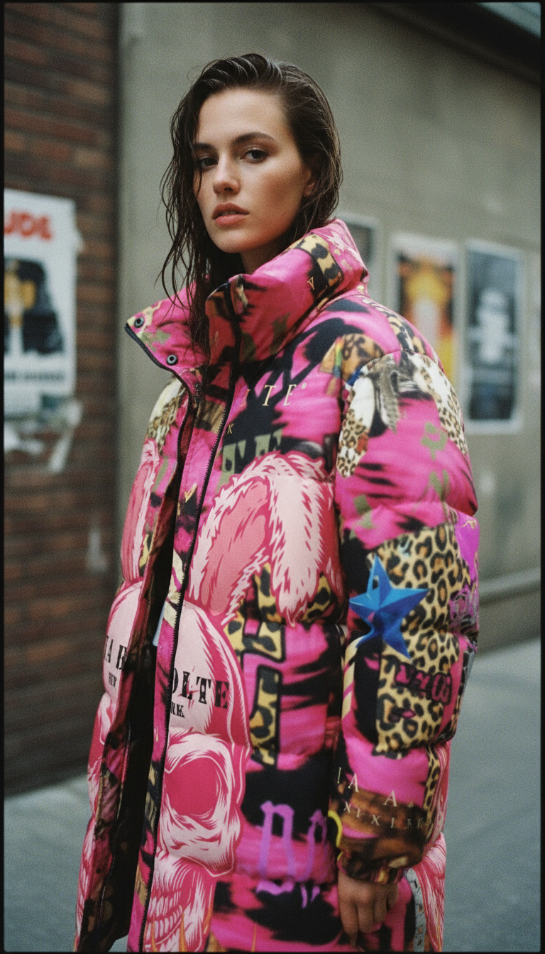 Der PIA BOLTE® Mantel – Pink Winter vereint rebellische Street-Couture mit kraftvollem Glamour. Das auffällige Design in Pink, Leo, Skull und Flammen zieht alle Blicke auf sich – ein echtes Fashion-Statement für kalte Tage. Der Mantel schützt zuverlässig vor Wind und Kälte, während der weiche Daunenmix für ein angenehmes Tragegefühl sorgt.