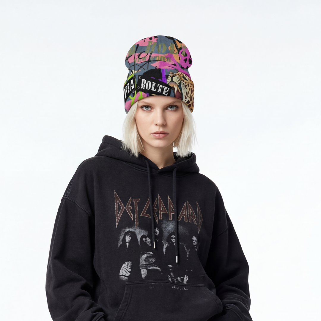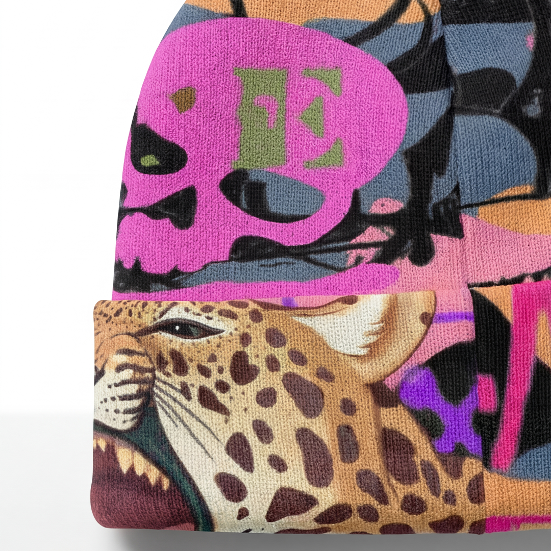 Die PIA BOLTE® Beanie – Colour Camou bringt Farbe, Energie und kompromisslose Attitude in deinen Winterlook. Das auffällige Design mit Leopard-, Skull- und Graffiti-Elementen vereint urbane Rebellion mit kreativem Streetstyle – laut, mutig und unverkennbar PIA BOLTE® NEW YORK.