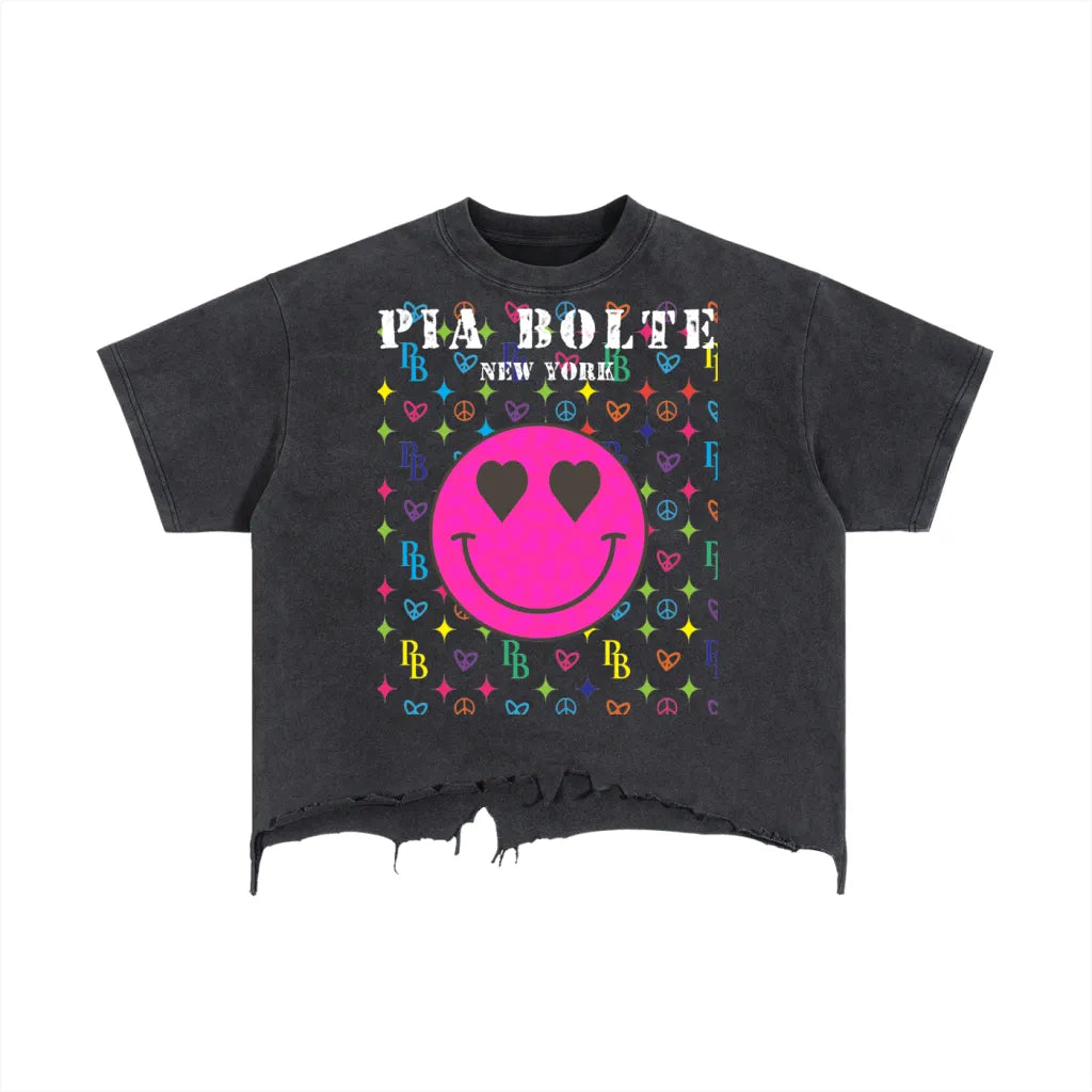 Der große Smiley mit Herzaugen trifft auf ein edgy, ausgefranstes Finish – ein Kontrast, der bewusst provoziert.