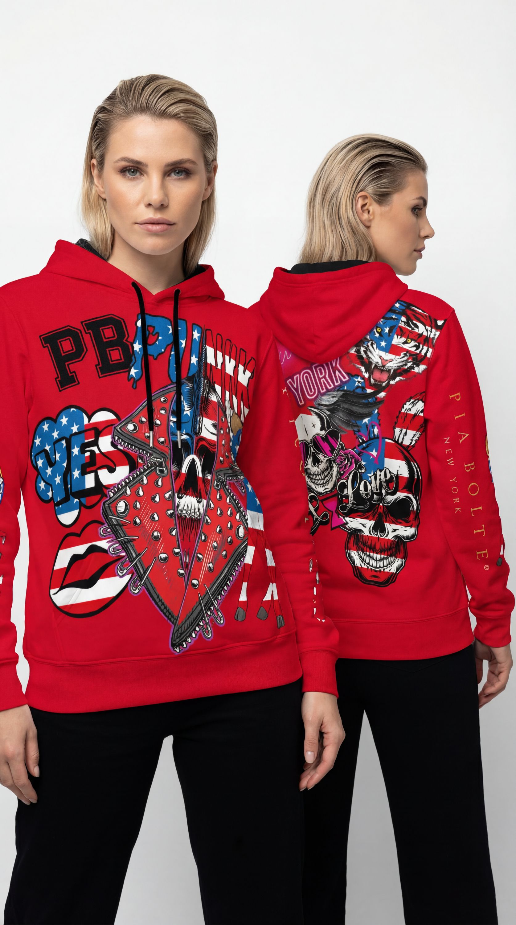 This powerful hoodie blends iconic PB typography, bold skull artwork and strong USA elements into a striking street-glam statement.