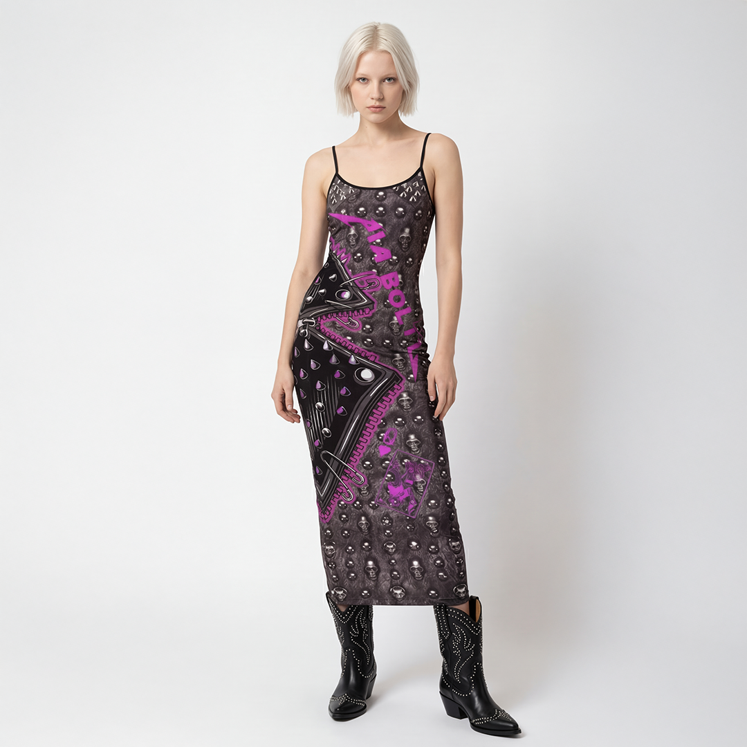 Grafische Skull-Elemente, Nieten-Details, urbane Statements und kontrastreiche Prints treffen auf eine figurbetonte Maxi-Silhouette. Das Design wirkt edgy, sexy und kompromisslos – ein echtes Statement für Clubnächte, Partys und besondere Momente.