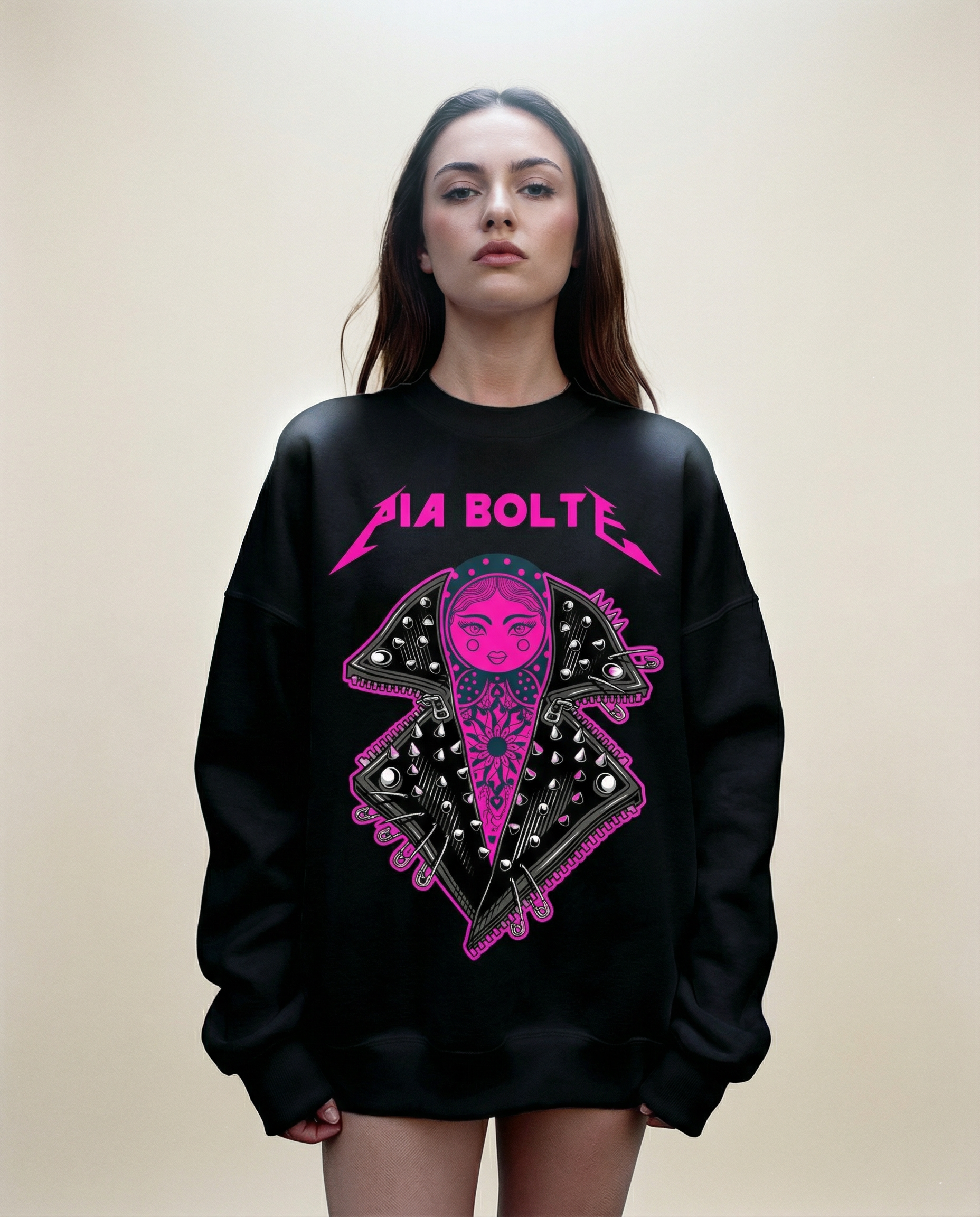 The PIA BOLTE® Sweatshirt – Rockstar Pink Icon features a striking illustrated character in a studded jacket on a relaxed crewneck silhouette. Neon pink artwork, PIA BOLTE® logo and the bold front print turn this piece into a true statement sweatshirt.