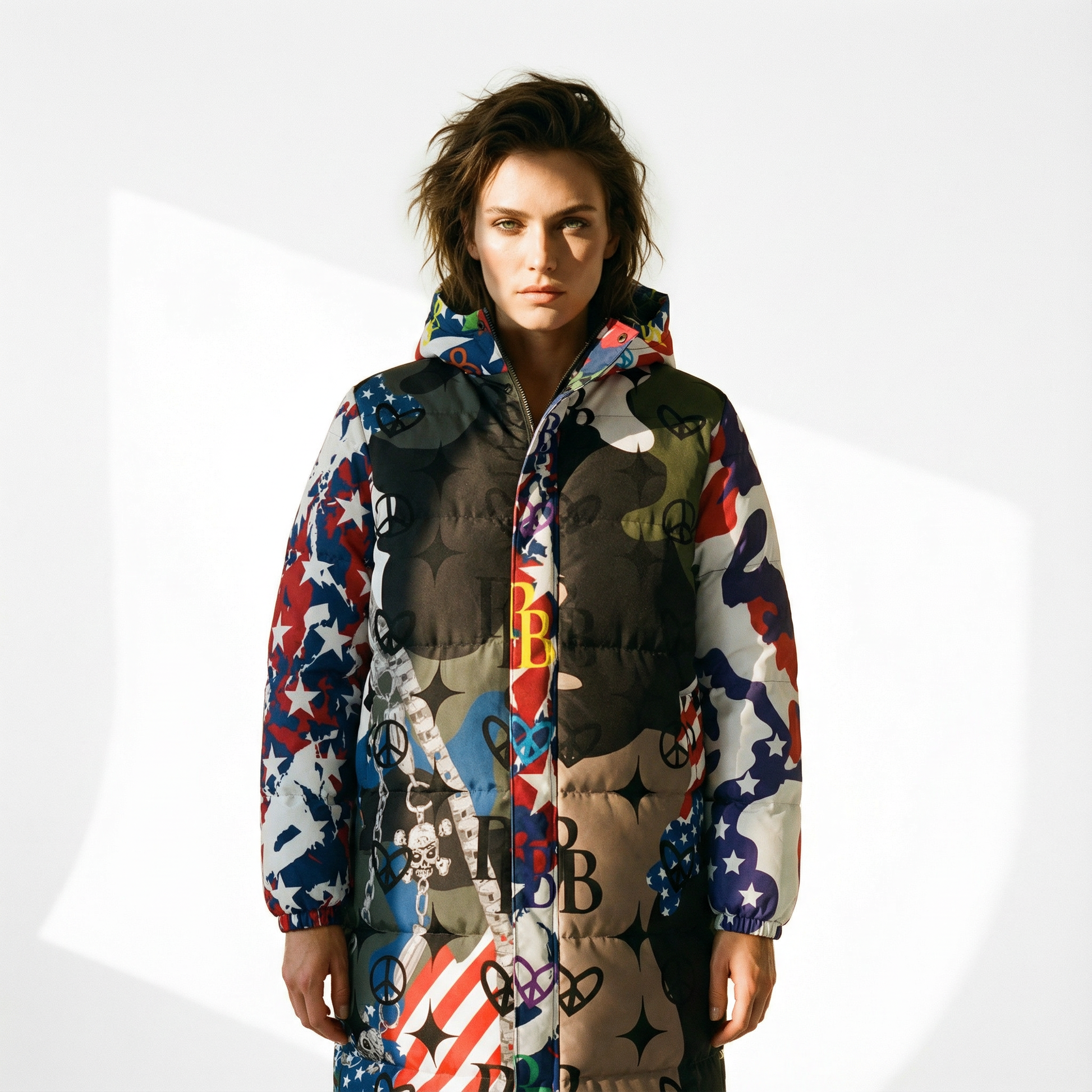 Der PIA BOLTE® Winter Mantel – EAGLE USA Camouflage kombiniert auffällige Prints mit funktionaler Wärme. Das kräftige Patchwork aus USA-Camo, Sternen, Farben und PB-Signature-Elementen macht diesen Mantel zu einem echten Statement-Piece für kalte Tage.
